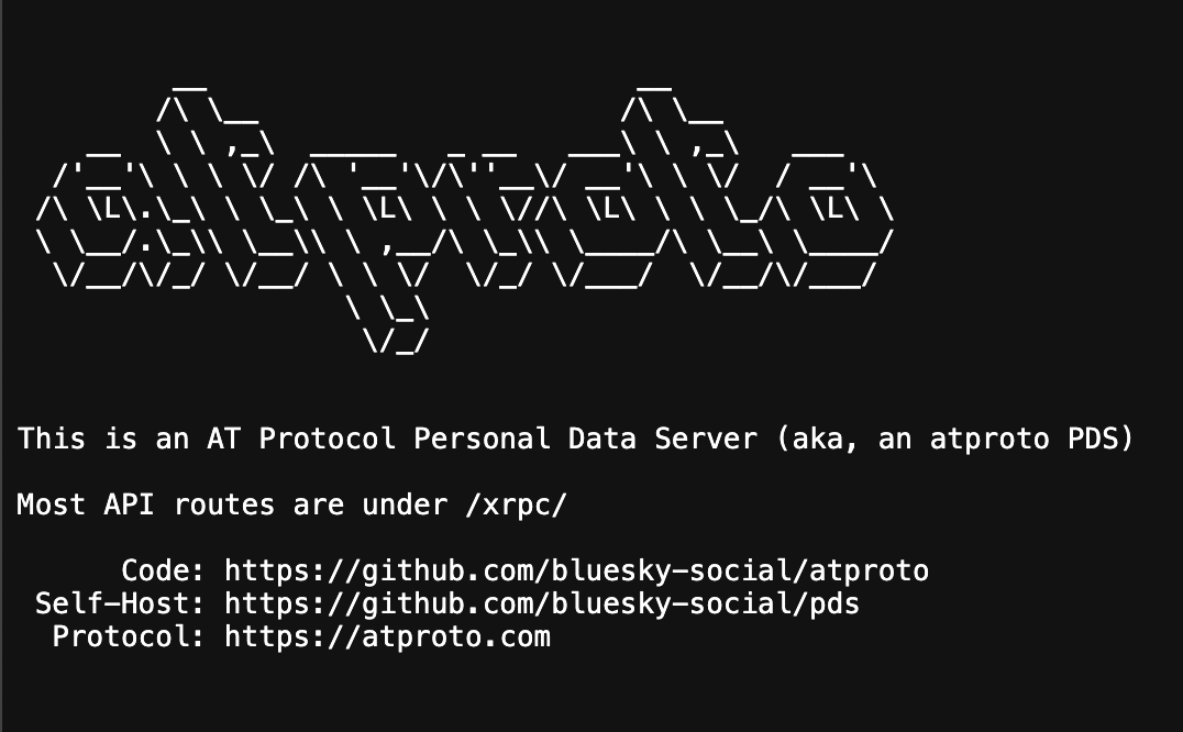helm upgrade atproto-pds bjw-s/app-template --namespace atproto-pds -f ./values.yamlAt this point, you should be able to hit pds.<yourdomain> in your browser and be greeted with the same welcome page we saw before. From here, you can use it the same way as if you used the installer script, you just need to figure out how to pass it the things like admin passwords and such to get your invite codes.
